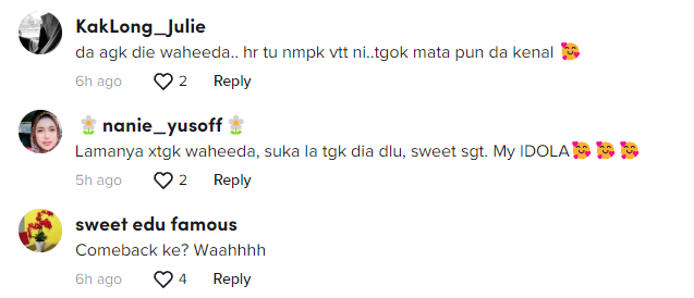 Meninjau di ruangan komen, rata-rata warganet meluahkan rasa rindu dan teruja apabila melihat perkembangan terbaharu tentang Waheeda yang sudah sekian lama tidak muncul. Bukan itu sahaja, ada juga mengatakan kagum dengan perubahan penyanyi itu kerana masih istiqomah dalam menutup aurat.