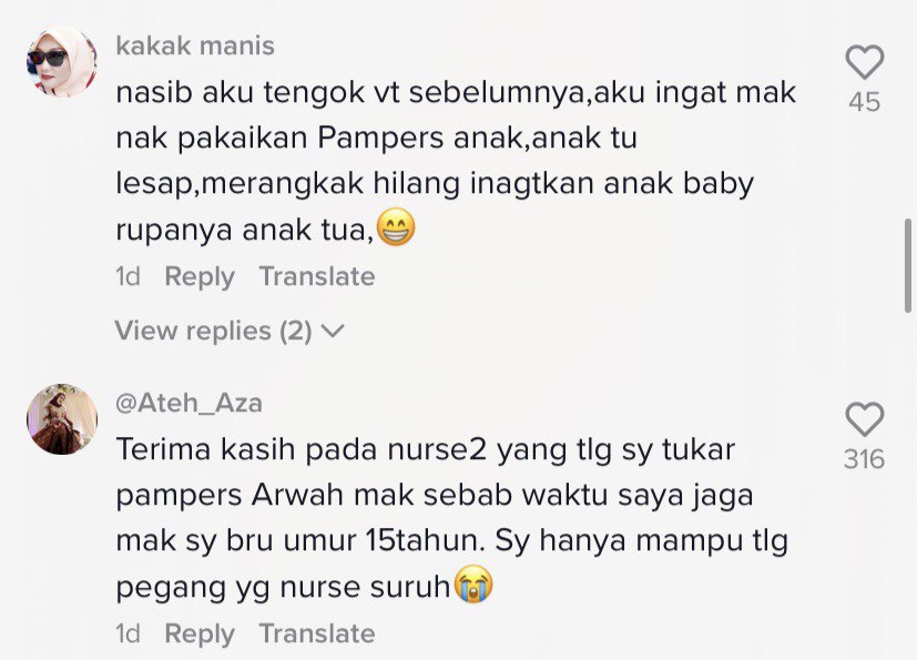 “Terima kasih pada nurse2 yang tlg sy tukar pampers Arwah mak sebab waktu saya jaga mak sy bru umur 15tahun. Sy hanya mampu tlg pegang yg nurse suruh😭”