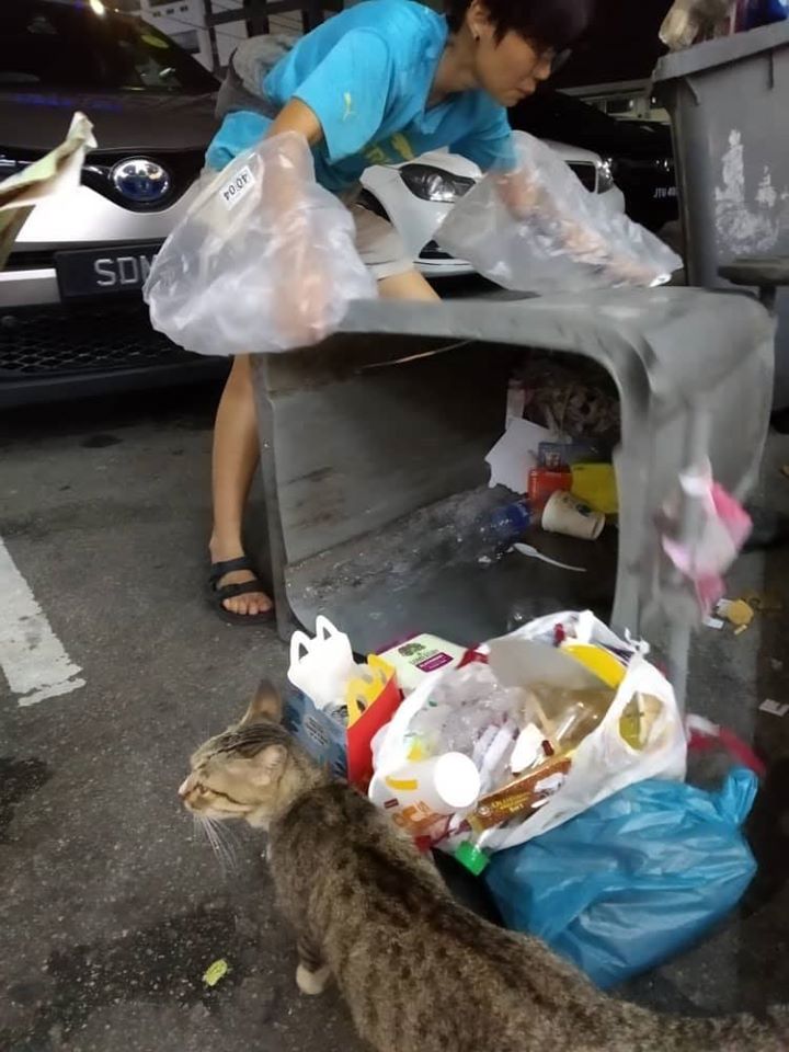 Seekor ibu kucing telah ditemui oleh seorang pemuda pada Tahun Baru Cina dan haiwan tersebut seakan meminta tolong menyelamatkan anak-anaknya yang berada dalam tong sampah.