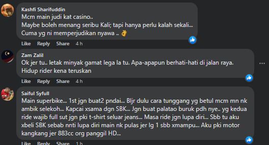 “Aku pun naik superbike, dulu selalu join macam2 group.. sebab sikap riding diorang la aku stop.. ada sesetengah geng2 ni tak boleh kena tegur, kita semua tau diorang laju, cilok sipi2 nak langgar kereta, tapi bila bagi nasihat.. kita pula kena perli”- Netizen