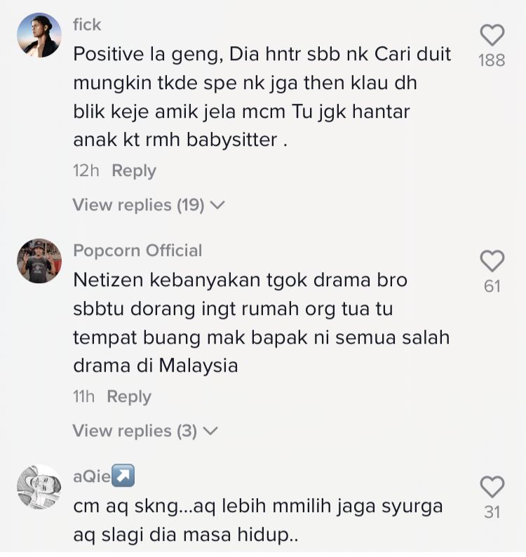 “Fikir eh, bayar rumah orang tua bukan murah tau, 800 sebulan, 600 sebulan, lepastu kita boleh pilih untuk ambil dia tiap minggu. Bukannya tak ambil terus, bukannya tinggal terus. While kita pun tengah kerja untuk sara dia..tak faham apa yang menyebabkan orang malaysia ni fikir letak orang tua dengan rumah orang tua ni satu benda yang derhaka”