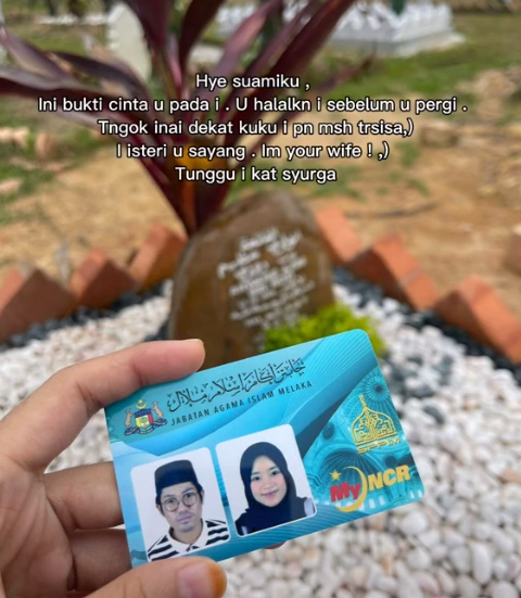 “Hye, i datang ni.. Harini i dnegan mama pergi ambil kad nikah kita sayang.. benda ni lah yang you tunggu2 untuk ambil start dari kita kahwin kan.. Ini bukti cinta u pada i..U halalkan i sebelum u pergi..Tengok inai dekat kuku i pun masih tersisa..I isteri u sayang.. I’m your wife! tunggu i dekat syurga” kata wanita tabah ini.