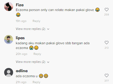 Meninjau di ruangan komen, rata-rata warga netizen yang juga mempunyai eczema akui boleh ‘relate’ dengan situasi tersebut kerana difahamkan ianya akan berasa sakit jika makanan tersebut pedas kerana luka yang ada di tapak tangan.