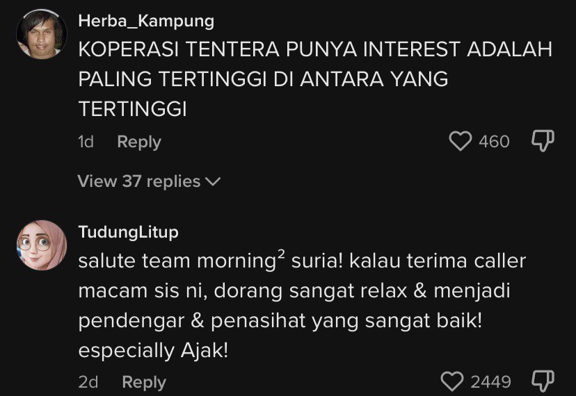 “salute team morning² suria! kalau terima caller macam sis ni, dorang sangat relax & menjadi pendengar & penasihat yang sangat baik! especially Ajak!”