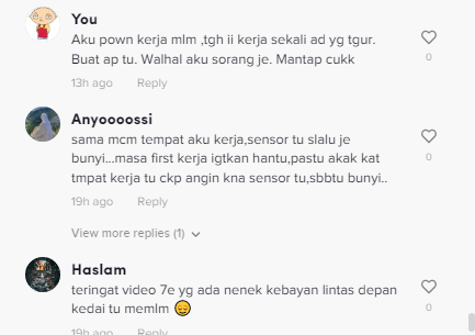 Bukan itu sahaja, ada juga beberapa orang netizen yang bekerja di kedai serbaneka 24 jam juga mendakwa pernah berdepan situasi yang sama serta banyak lagi situasi tidak terjangka pernah terjadi pada waktu malam malah sudah lali dan menganggap kejadian seperti itu normal.