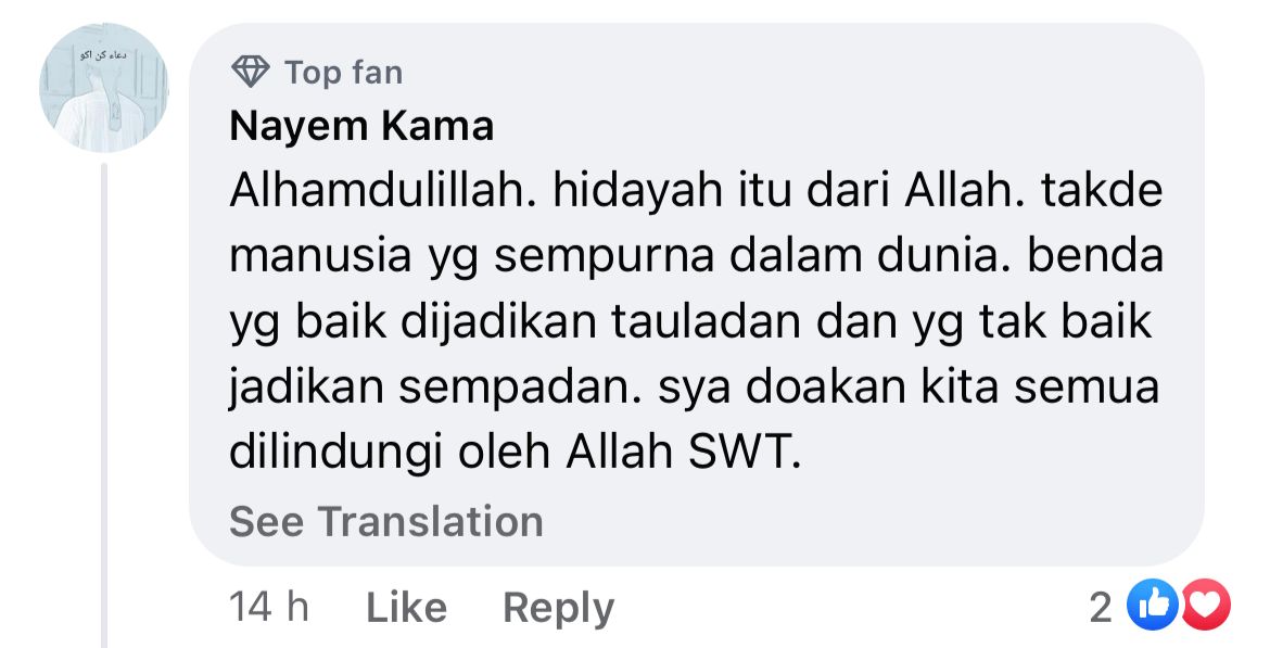 “Alhamdulillah. hidayah itu dari Allah. takde manusia yg sempurna dalam dunia. benda yg baik dijadikan tauladan dan yg tak baik jadikan sempadan. sya doakan kita semua dilindungi oleh Allah SWT.”