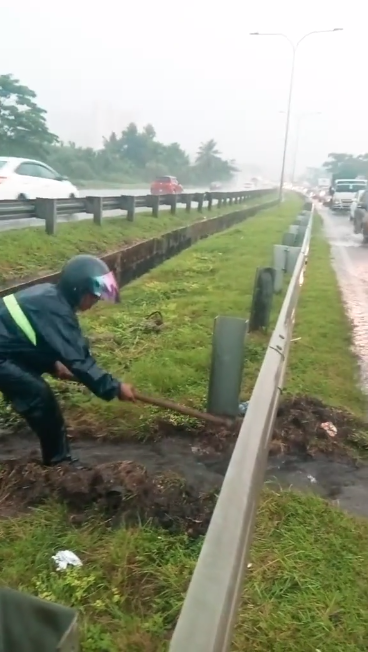Menerusi video yang dimuat naik oleh seorang pengguna TikTok iaitu @Juharmariankha, seorang lelaki menggali saluran di pinggir lebuhraya untuk dijadikan longkang bagi mengalir keluar air yang bertakung di atas jalan.