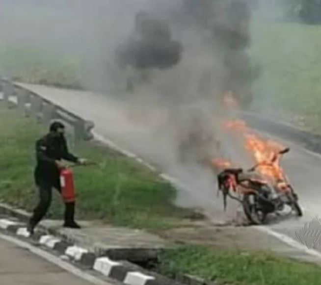 “Mohd Redzuan bergegas datang membantu memadamkan kebakaran. Walaubagaimanapun api cepat marak dan memusnahkan keseluruhan motosikal tersebut,” katanya.