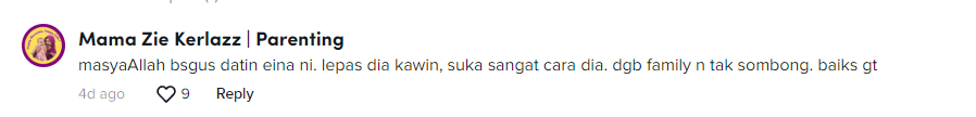 “masyaAllah bagus datin eina ni. lepas dia kawin, suka sangat cara dia dengan family dan tak sombong… baiks sangat…”