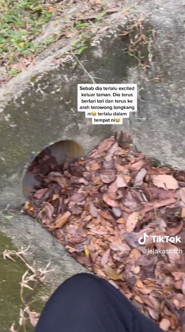 “Tapi aku rasa menyesal dan malang.. sebab dia terlalu excited keluar taman.. dia terus berlari-lari dan terus ke arah terowong longkang ni.. terlalu dalam tempat ni” tambahnya lagi.