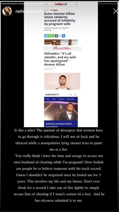 Namun, menerusi Insta Story Nellisa tampil menunjukkan perbualannya bersama suaminya menunjukkan Ammar mengakui telah menidurri wanita lain dan memohon maaf kepada isterinya itu.