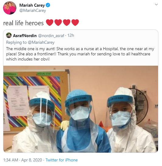 Asraf membalas tweet Mariah dengan foto ibu saudaranya, jururawat bersama dua rakan sekerja lengkap dengan pakaian personal protective equipments (PPE) di sebuah hospital.