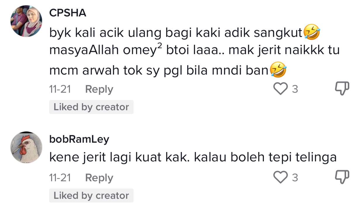 “byk kali acik ulang bagi kaki adik sangkut🤣masyaAllah omey² btoi laaa.. mak jerit naikkk tu mcm arwah tok sy pgl bila mndi ban🤣”