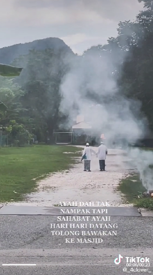 Difahamkan, penglihatan bapanya sudah tidak beberapa jelas. Oleh sebab itu, rakannnya ini sentiasa datang dan menjemput setiap kali tiba waktu solat untuk sama-sama ke masjid yang berdekatan.