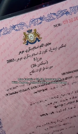 Dalam pada masa yang sama, wanita ini menyifatkan wang hantaran sebanyak RM7,000 dan RM22.50 untuk mas kahwin mengikut negeri kelahiran itu sememangnya berbaloi supaya tidak menanggung hutang ataupun terganggu dengan masalah kewangan pada masa akan datang.